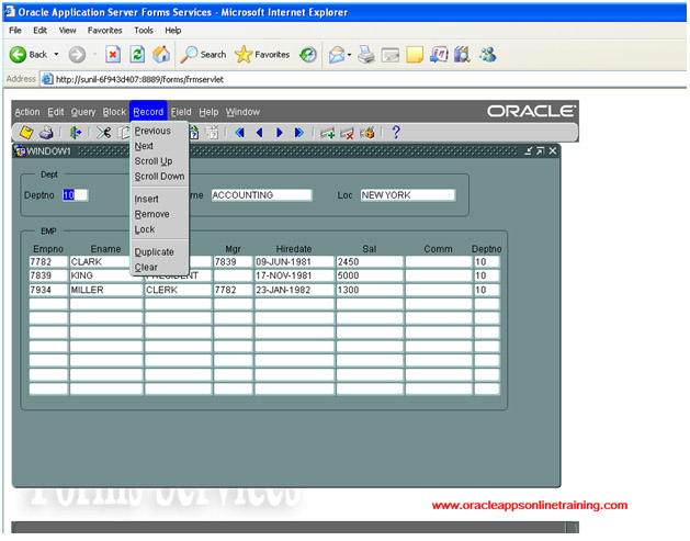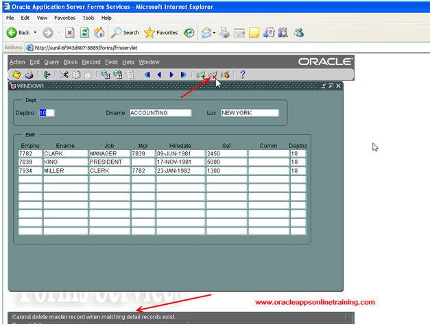 Keep the cursor in the master block, click on delete button, observe that message in the bottom of the form. Cannot delete master record when matching detail records exist.