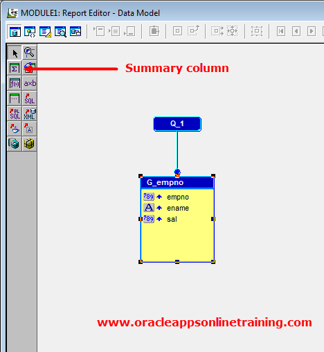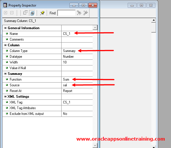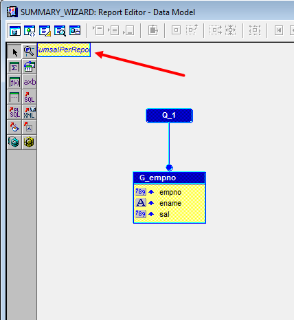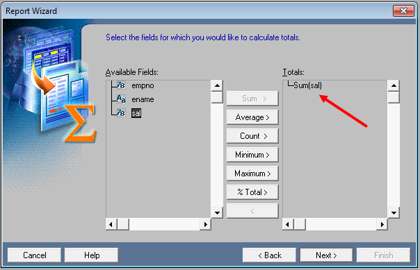 Open report builder tool Use the report wizard OkNext Create both Web and Paper layout Next Tabular SQL Query select empno, ename, sal from emp where deptno =10; Connect � provide connection details Next Move all the fields from Available Fields to Displayed Fields Next Select sal from available Fields , click on sum