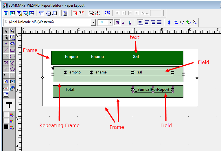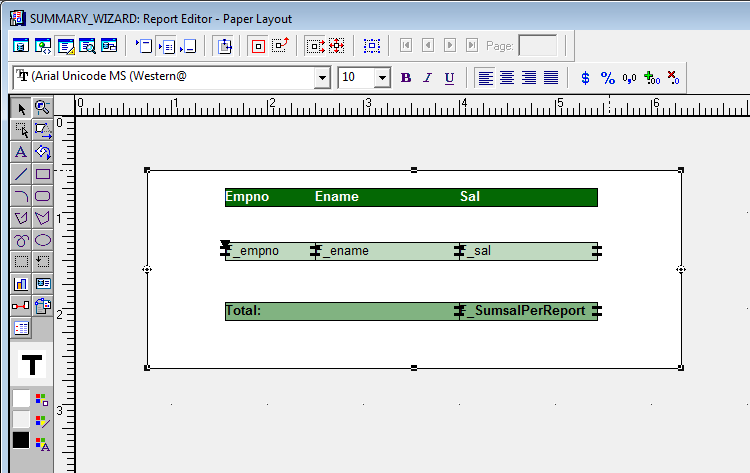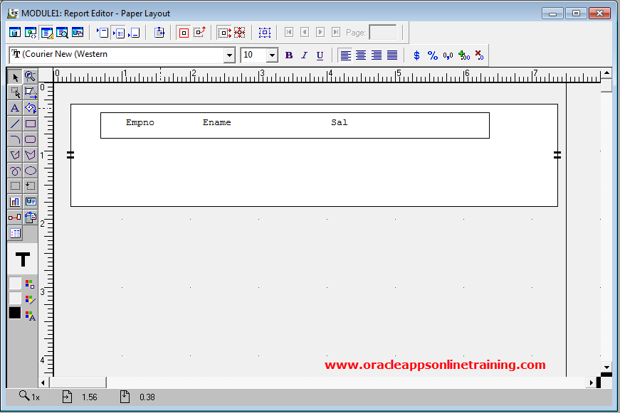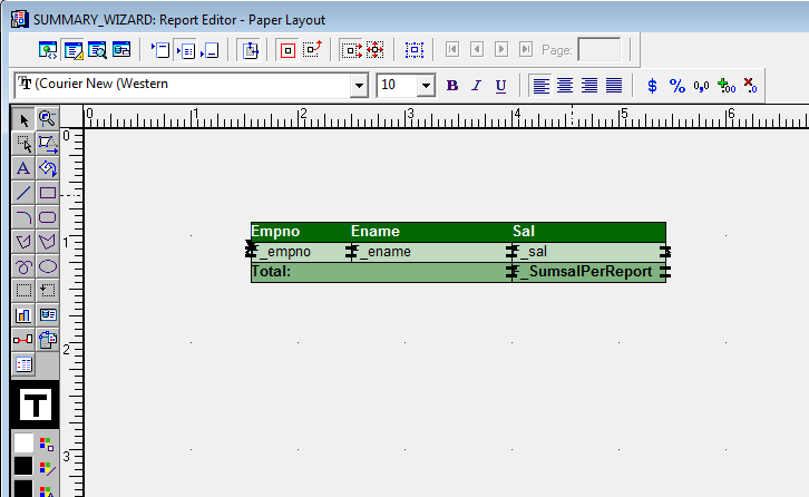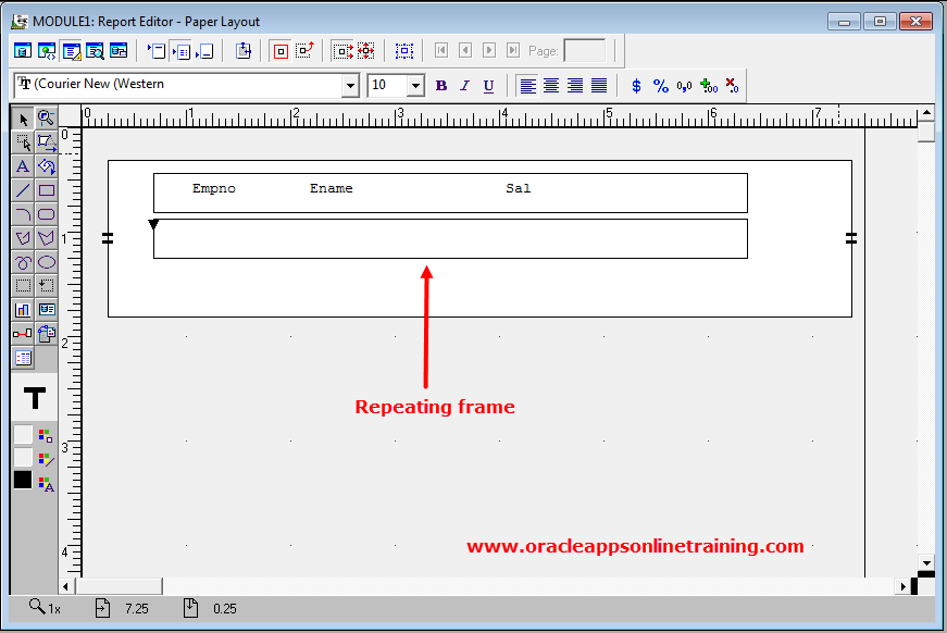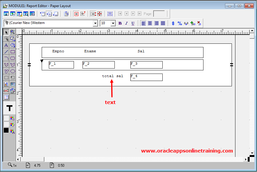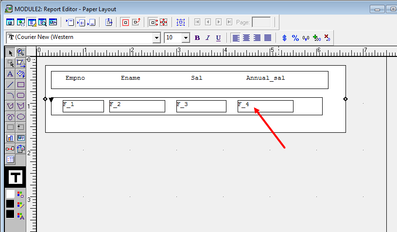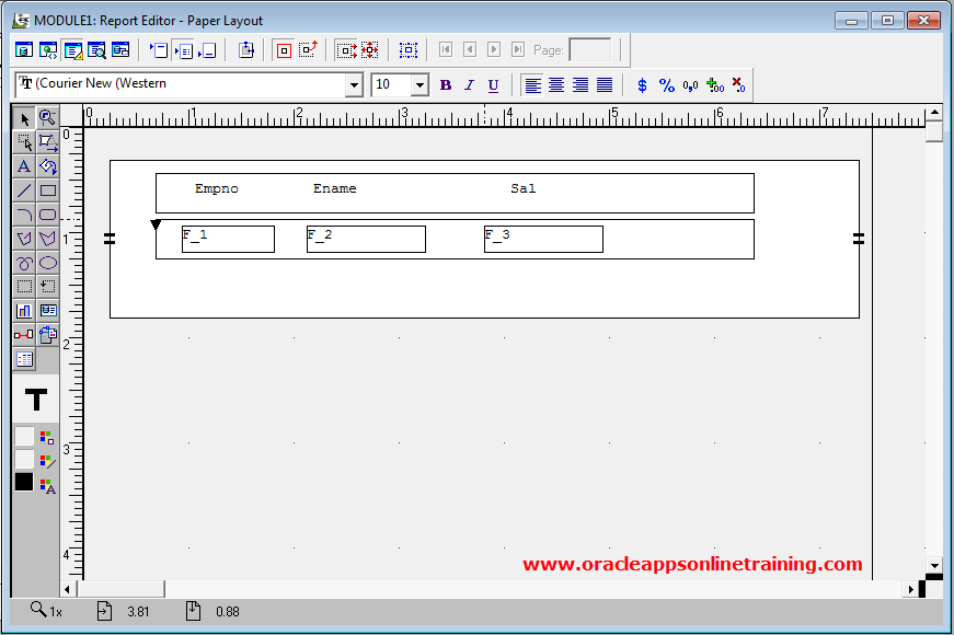 Click on text, place three text items ( Empno, Ename, sal ) in the inner frame.