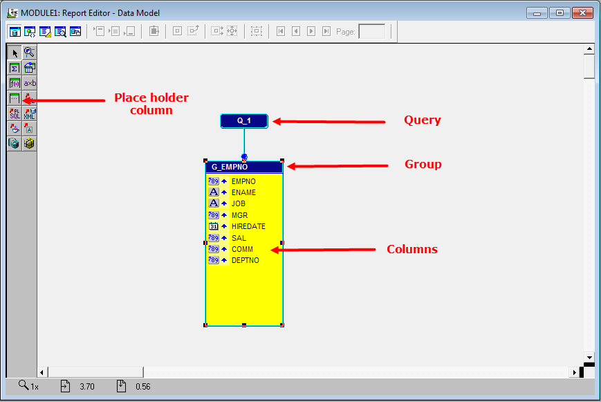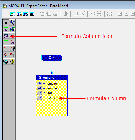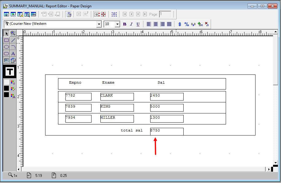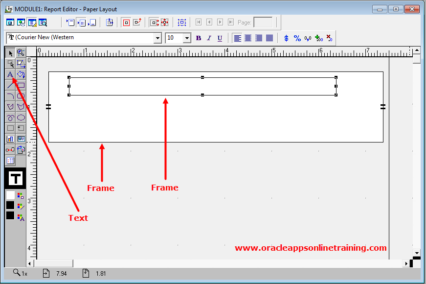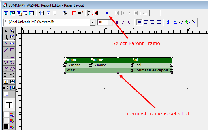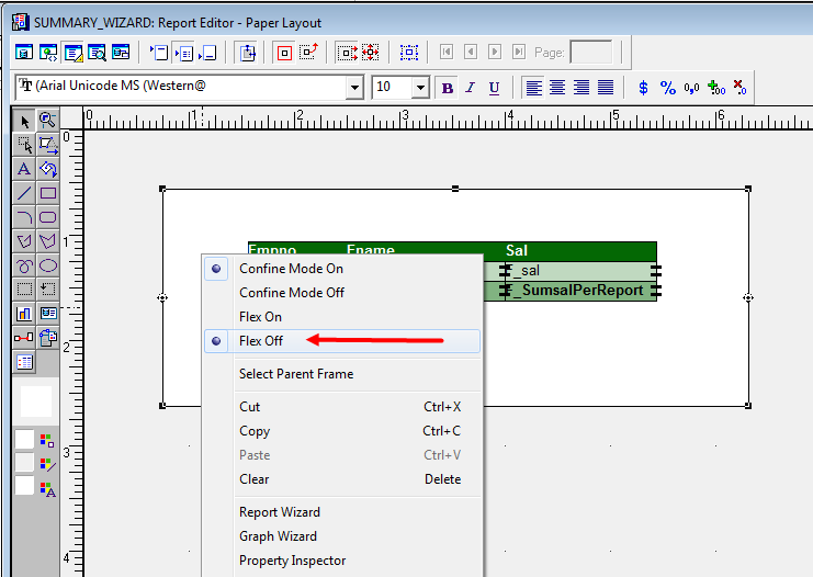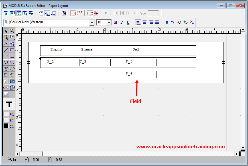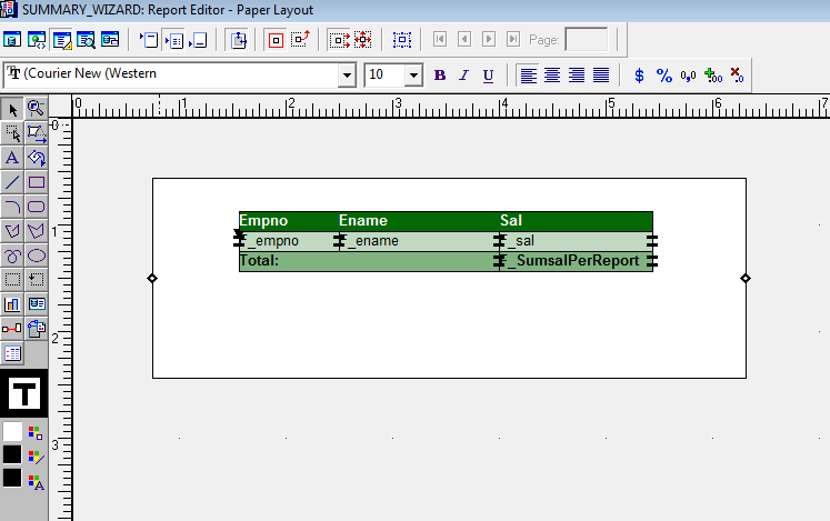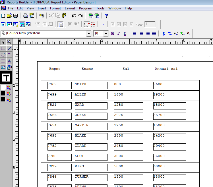 Click on text, place three text items ( Empno, Ename, sal ) in the inner frame.