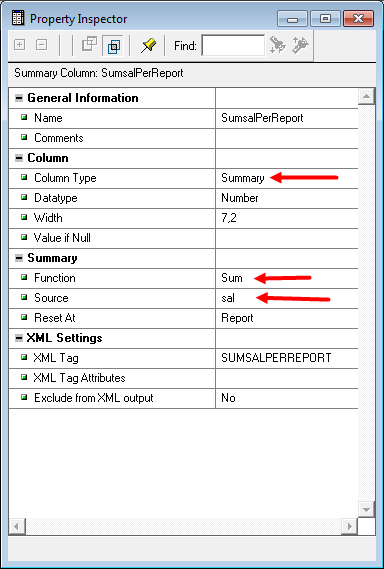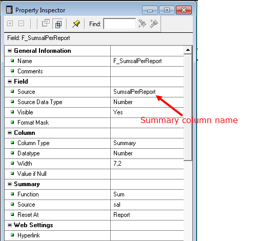 Observe the source for the field F_SumsalPerReport, it is SumsalPerReport ( Summary Column Name )