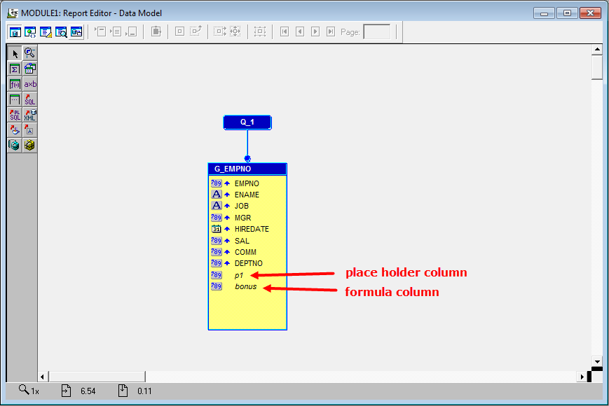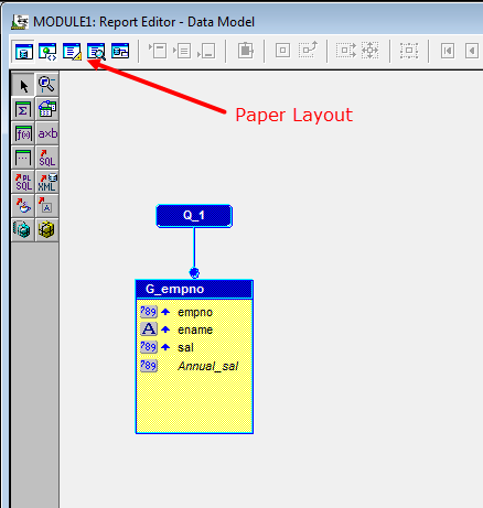 Invoke the report wizard by click on Tools Report Wizard Create both Web and Paper Layout Select Tabular SQL Query Data source definition : select * from emp ( Query is present ) Move all the fields from Available Fields to Displayed Fields ( Observer we have 10 fields ) Next Next Select No template Finish